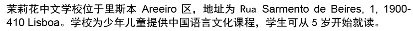 | A Escola Chinesa Molihua, situada na Rua Sarmento de Beires, 1, 1900-410 Areeiro, Lisboa, proporciona Curso Juvenil de Língua e Cultura Chinesa, destinado a alunos do ensino básico, podendo começar a partir dos 5 anos de idade. |