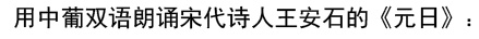 Declamação em chinês e português do poema Ano Novo, de Wang Anshi, Dinastia Song