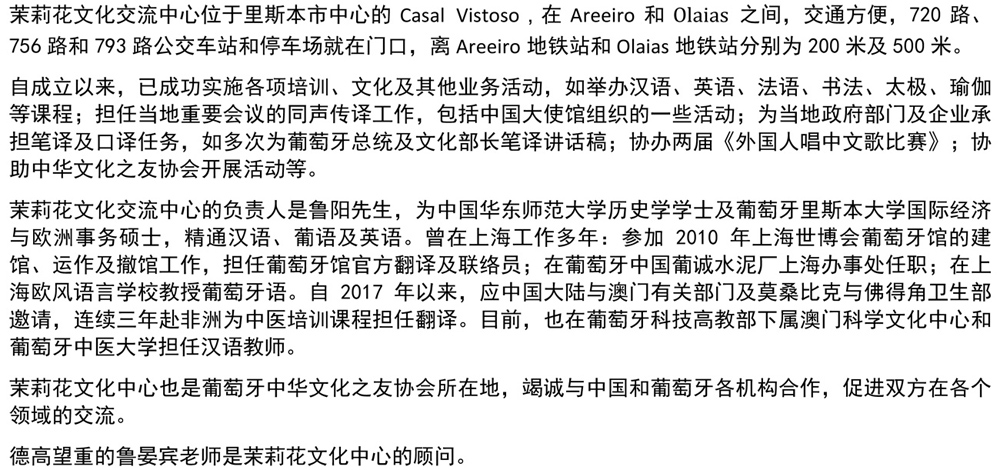 O Centro Molihua, sediado em Portugal, tem como missão promover o intercâmbio cultural entre a China e Portugal e como serviços principais a formação, a consultoria, a tradução/interpretação e a organização de eventos culturais, entre outros.
